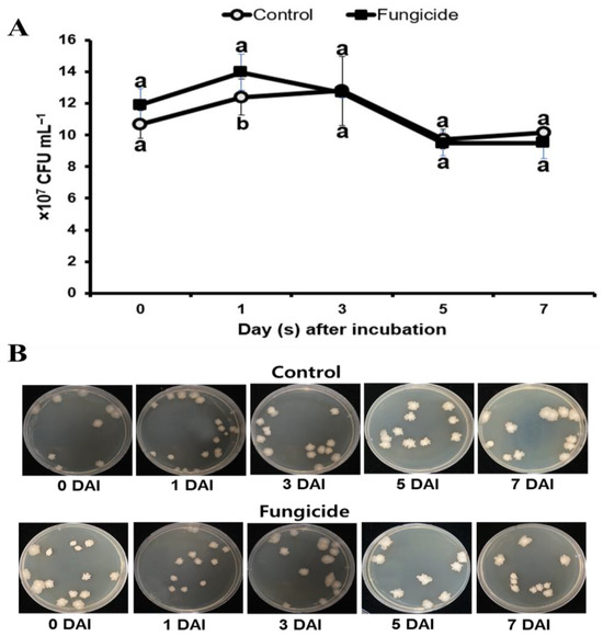 Effect of chemical fungicide (50% trifloxystrobin, 250 ppm) on the survival of B. subtilis PE7. (A) Growth rate comparison between the control and fungicide-treated B. subtilis PE7 at a concentration of 250 ppm. Different letters indicate significant differences between control and fungicide treatment according to Student’s t-test (p < 0.05). (B) Consistent colony numbers of strain PE7 from 0 to 7 days after incubation in both control and fungicide treatments.