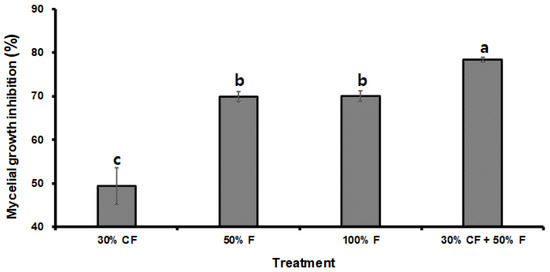 Inhibition of D. bryoniae mycelial growth treated with varying concentrations of B. subtilis PE7 culture filtrate (CF) and fungicide (F), as well as their combination (100% F and 50% F correspond to 250 ppm and 125 ppm of 50% trifloxystrobin, respectively). The data were presented as the mean ± standard deviation of three replicates. Different letters in the bar graph indicate significant differences between treatments, as determined by the least significant difference (LSD) test at a p < 0.05 significance level.