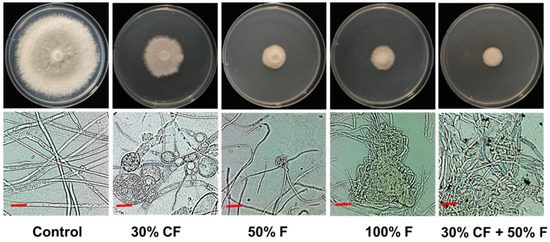 The mycelial growth was significantly inhibited in both the CF and F treatments compared to the control, which exhibited normal mycelial development. The highest inhibition occurred with the combined treatment (30% CF + 50% F) compared to other treatments (30% F, 50% F, and 100% F). Microscopic examination of the hyphal morphology of the fungal pathogen D. bryoniae revealed abnormal expansion and alterations in the morphology of D. bryoniae treated with fungicide and CF. Notably, more severe damage characterized by twisting, excessive branching, bulging, and irregular twisting was observed in the treatment with 30% CF and the combined treatment (30% CF + 50% F) compared to the other fungicide treatments (Figure 5).