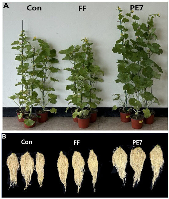 Compared to the control group (Con), melon plants treated with the broth culture of B. subtilis PE7 (PE7) exhibited significantly higher levels of major macronutrients, as detailed in Table 2. Specifically, the PE7-treated plants exhibited notable increases in nitrogen (N) at 199.23 mg plant−1, potassium (K) at 488.27 mg plant−1, magnesium (Mg) at 98.76 mg plant−1, and calcium (Ca) at 328.86 mg plant−1. However, there were no significant differences observed in macronutrient levels (P, K, Mg, and Ca) between the control and PE7-treated groups. Furthermore, the PE7 treatment resulted in elevated levels of micronutrients in melon plants compared to both the Con and FF treatments. Notably, the concentrations of manganese (Mn), boron (B), copper (Cu), iron (Fe), and zinc (Zn) increased to 7.56, 344.34, 1450.49, 30.82, and 0.50 mg plant−1, respectively, in the PE7-treated plants. However, there were no significant differences in micronutrient levels (Cu and Fe) between the FF and PE7 treatments. Additionally, the concentration of molybdenum (Mo) was found to be lowest in the PE7-treated plants at 4.07 mg plant−1 compared to the plants in the Con group at 7.25 mg plant−1 and the FF treatment at 6.43 mg plant−1.