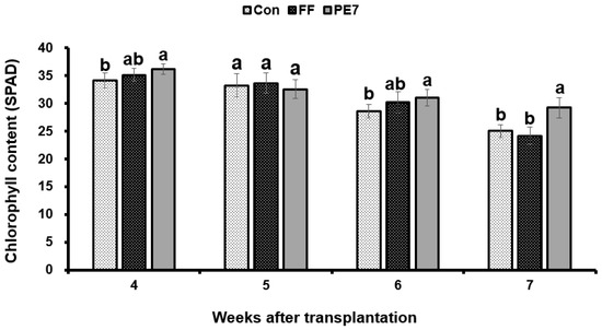 Chlorophyll content of melon leaves of different treatments at different weeks (4–7) post-transplantation. Con: fertilizer only; FF: fertilizer combined with fungicide; PE7: Broth culture of B. subtilis PE7. Different letters above each bar (grouped by post-transplantation week) indicate significant differences between treatments, as determined by the least significant difference (LSD) test at a p < 0.05 significance level.