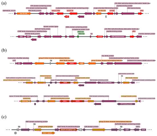 The aac(6′)-Ie-aph(2″)-Ia gene was found in isolate 23-150 and ST2672 isolates (Figure 1c), sharing a similar genomic context, differing only by the presence of a “group II intron reverse transcriptase/maturase” element. Downstream of this gene, genes encoding phage elements were annotated.