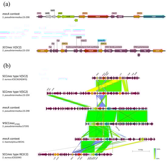 Genomic context of mecA. (a) SnapGene Viewer visualization of the genomic context of mecA in isolates 23-150 and 23-298. (b) EasyFig comparison of the genomic context of mecA in isolates 23-150 and 23-298 with SCCmec type V(5C2) from S. aureus JCSC3624(WIS) (GenBank: AB121219.1), ΨSCCmec57395 pseudocassette from S. pseudintermedius strain 57395 (GenBank: HE984157.2), mecA context from S. haemolyticus WCH1 (GenBank: JQ764731.1), and SCCmec type IX(1C2) from S. aureus JCSC6943 (GenBank: AB505628.1). In red, mecA gene; in orange, elements responsible for mobilization and reorganization of the cassette; in light blue, ∆mecR1; in green, gray, and teal, genes responsible for arsenic, cadmium, and copper resistance, respectively. Homology gradients range from green (100%) to yellow (85%), and violet to light blue (85%) for inverted regions.