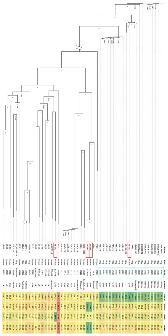 Since isolate 23-150 belonged to the MLST ST551, a search for ST551 genomes was conducted within the NCBI Nucleotide database using the query “pseudintermedius AND ST551”, from which we retrieved 19 genomes (1 from Felis catus, 13 from Canis lupus familiaris, and 5 from environmental samples). Representative genomes corresponding to ST159 and ST498, the nearest sequence types to the newly identified ST2673 in this study, were also sought, retrieving one and two genomes isolated from dogs, respectively. The terms “pseudintermedius and “Homo sapiens”” were concurrently used to retrieve the first 23 genomes of S. pseudintermedius isolated from human cases. Consequently, our dataset encompassed a total of 50 genomes, including the reference genome (CP065921.1) and the isolates from our study (refer to Supplementary Table S1 for details of all the genomes from NCBI). Phylogeny was inferred by calling single nucleotide polymorphisms (SNPs) using CSIPhylogeny [35] v1.4. The Newick file obtained was visualized using FigTree v1.4.4 (available at http://tree.bio.ed.ac.uk/software/figtree/, accessed on 15 January 2024). Average nucleotide identity (ANI) against the 46 downloaded genomes was calculated with FastANI [36].