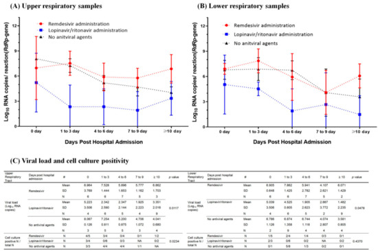 SARS-CoV-2 viral loads determined using RdRp gene-targeted real-time reverse transcription-polymerase chain reaction in upper respiratory (nasopharyngeal swab) (A) and lower respiratory (sputum) (B) tract samples. Viral load and cell culture positivity showing infectious viral shedding in upper and lower respiratory tract samples (C) were obtained from patients treated with remdesivir, lopinavir/ritonavir, or no antiviral drugs. N, number of samples; NA, not assayed.