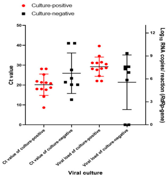 We compared infectious viral shedding, as determined by cell culture, and the Ct values of RdRp gene-targeted real-time RT-PCR of the upper and lower respiratory tract samples on the day of hospitalization (day 0). The positivity rate for viral cultures on day 0 was 61.9% (13 of 21 cases). The median Ct value and the mean viral load of culture-positive samples on day 0 were 20.08 and 7.59 × Log10 RNA copies/reaction, respectively. The mean viral copy number of culture-positive samples on day 0 (3.93 × 107 RNA copies) was higher than that of culture-negative samples (3.66 × 105 RNA copies) (Figure 2).