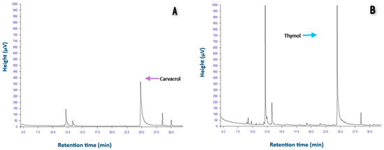 Major components of the EOs. (A) A chromatogram of LEO; the primary component, carvacrol, showed a retention time of 24.8 min. (B) A chromatogram of TEO; the significant component thymol, recorded a retention time of 24.4 min.
