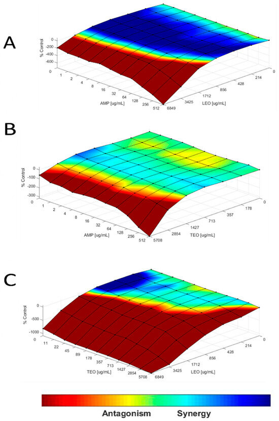 In the Bliss synergism and antagonism model, it was observed that at low concentrations, ampicillin and EOs have synergistic interactions, which become antagonistic interactions as the concentration increases (Figure 4A). Considering the % control, the positive points indicate synergy and the hostile ones, antagonism; likewise, in the Bliss synergy and antagonism model the interactions <100% were considered weak, between 100% and 200% were considered moderate, and >200% strong [13].