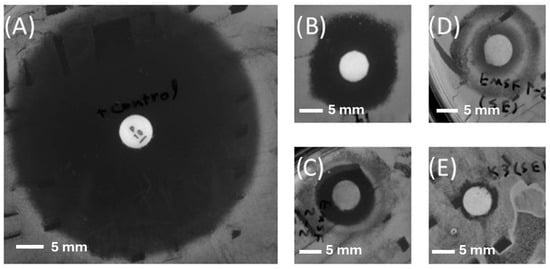 The disc diffusion assay results for (A) the positive control (Penicillin 10 µg), (B) EL 19 (EtOAc-extracted), (C) EMSF 2-2 (EtOAc-extracted), (D) EMSF 1-2 (EtOAc-extracted), and (E) EK3 (EtOAc-extracted) against S. aureus ATCC 25923.