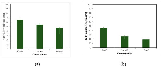 The MTT staining method for EL 19 EtOAc extracts demonstrated significantly lower cell viability compared to the negative control and, to some extent, reduced biofilm formation at the greatest concentrations tested. For MRSA M180920, reductions in biofilm cell viability were observed from 43% to 47%, when tested at × MIC. At the same concentration, EL 19 extracts caused cell viability reductions ranging from 57% to 68% in S. aureus ATCC25923, suggesting greater effectiveness against methicillin-sensitive S. aureus at this concentration. Similar trends were observed at × MIC and × MIC, with greater cell viability reductions against S. aureus ATCC25923 (ranging from 52% to 56% for × MIC and 34% to 48% for × MIC) compared to MRSA M180920 (ranging from 22% to 28% for × MIC and 17% to 19% for × MIC). The reduction in cell viability induced by the MTT staining method for each bacteria can be observed in Figure 4.