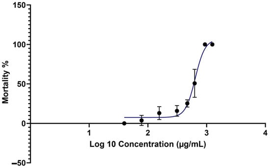 Finally, the mortality rates of the brine shrimps were plotted against Log10 (Concentration) using GraphPad Prism 10 version 10.0.2. The software was used to determine the LC50 value, the 95% confidence interval, and the value of the fitted curve.