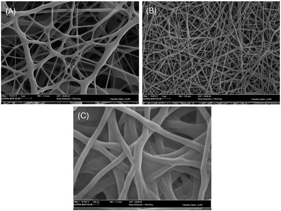 The morphology of 15 wt% PCL fibers (A) with no additives, (B) 1.89 mg/mL EtOAc extracts of EL 19, and (C) 3.716 mg/mL EtOAc extracts of EL 19.