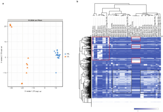 The partial least squares and hierarchical bi-clustering of protein family (Pfam) domains from 40 P. marinus isolates. (a) Cluster analysis using cluster-based partial least squares (PLS) of the 40 P. marinus strains. This method shows separate clustering for high-light (HL) and low-light (LL) strains represented in blue and orange, respectively; (b) heatmap of Pfam domains for 40 P. marinus species showing the clustering of distinct Pfam groups in HL and LL strains on the right and left sides, respectively. The 40 strains are represented on the X-axis with LL and HL; approximately 1000 different Pfams are represented on the Y-axis. The red and black rectangles highlight the different patterns of Pfam counts among clusters of LL and HL strains, respectively.