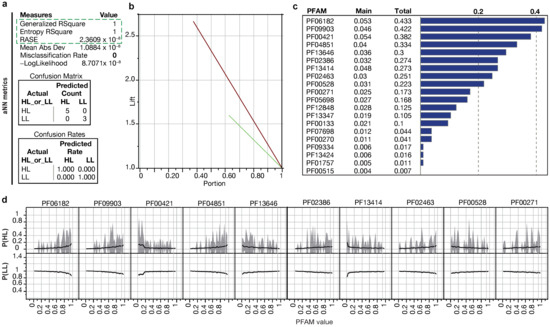 An artificial neural network (ANN) reconstructed from the top ten differing Pfams in HL and LL strains (n = 40). (a) Performance of the training model using three TanH nodes in a single-layer neural network using a squared penalty and transformed covariates. The input dataset consisted of normalized sum bit scores of Pfams. These metrics describe the performance of the model using a randomly selected 20% holdout set of genomes that were removed before model creation. The model demonstrates a misclassification rate of zero (green box) based on the unknown set of Prochlorococcus genomes; (b) the lift curves for the training (green) and validation (red) (holdout) sets. The lift curves show how well the variables perform at prediction per sample size; (c) assessment of variable importance in the creation of the ANN model. The influence is shown regarding the total effect and main effect for classification; (d) marginal model plots for the variables used to create the model. The Y-axes represent probabilities for predicting whether a strain is an HL or LL strain as a function of each Pfam. As the copy number of a Pfam increases, the probability of either HL or LL is determined.