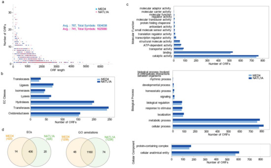 The sequence length distribution and EC class GO term distribution among the MED4 and NATL1A ORFs. Panel (a) represents the sequence length distribution with an average of 767 bp and 741 bp for MED4 and NATL1A, respectively. Classification of the enzyme commission numbers assigned to the ORF sequences to MED4 and NATL1A; (b) representation of GO annotation level distribution after GO-Slim for MED4 and NATL1A; (c) the number of sequences (X-axis) and the GO terms (Y-axis) for biological processes, molecular functions, and cellular compartment ontologies are shown for both strains; (d) functional annotation analysis using Blast2GO. Comparison between the MED4 and NATL1A strains based on GO annotations and enzyme commission (EC).