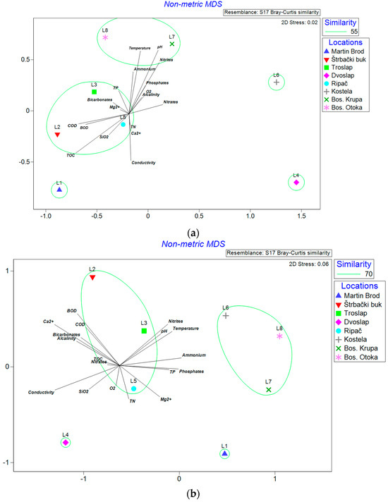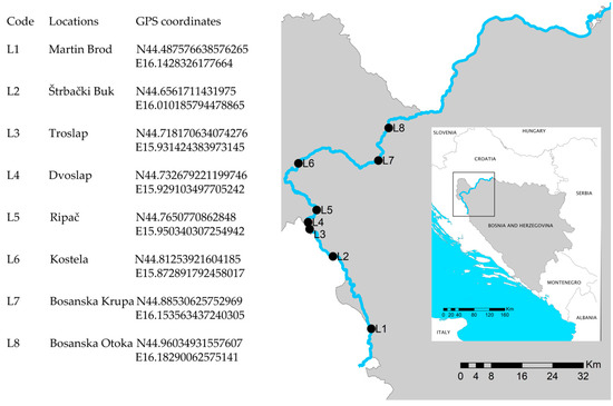 - Bakrač, A.; Rimceska, B.; Bilbija, B.; Atanacković, A.; Džaferović, A.; Nikolić, V.; Marković, V. Aquatic Macroinvertebrates Diversity in the Upper Stretch of Una River (Una National Park, SW Bosnia and Herzegovina). Ecol. Balk. 2021, 13, 131–141. [Google Scholar]
