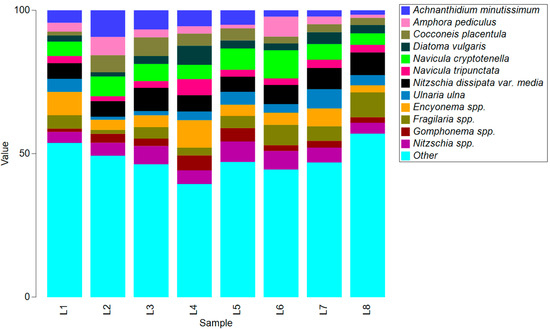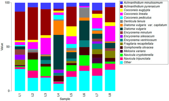 - Bailet, B.; Apothéloz-Perret-Gentil, L.; Baričević, A.; Chonova, T.; Franc, A.; Frigerio, J.-M.; Kelly, M.; Mora, D.; Pfannkuchen, M.; Proft, S.; et al. Diatom DNA Metabarcoding for Ecological Assessment: Comparison Among Bioinformatics Pipelines Used in Six European Countries Reveals the Need for Standardization. Sci. Total Environ. 2020, 745, 140948. [Google Scholar] [CrossRef]