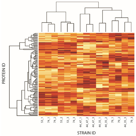 Heatmap showing the protein abundance of two clinical reference strains LS-1 (53) (1,2,3) and SH1000 (74) (1,2,3), and three clinical strains CCUG 74309 (44_35) (1,2,3), CCUG 74310 (44_47) (1,2,3) and CCUG 74311 (79) (1,2,3) when compared to the Newman strain. The y-axis shows the protein IDs, whereas the x-axis shows the strain ID number for each individual strain analysis performed in triplicates. Red colour indicates a higher abundance, whereas yellow signifies a lower abundance (fold change (FC) of strain compared to Newman). Clustering regarding similarity in high or low abundance as compared to the Newman strain was allowed for the protein identification (PROTEIN ID) but was also allowed for the samples (STRAIN ID), strains showing similar patterns in the protein abundance profiles cluster together. Here, in this cluster analysis, only values passing p-values < 0.05 from the ANOVA analysis is included.