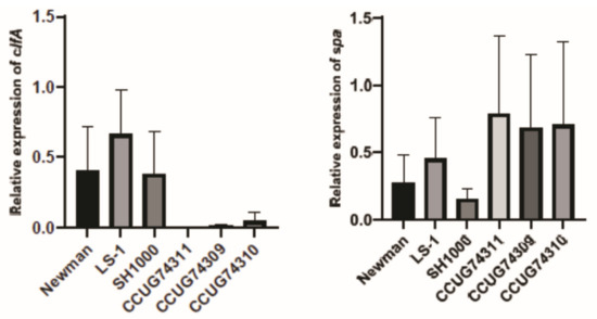 A quantitative PCR (qPCR) was performed as described by [53] (Supplemental Information File S1). Briefly, cDNA was synthesized with iScript™ cDNA Synthesis Kit (Bio-Rad, Hercules, CA, USA) as indicated by the manufacturer; the products were kept at −20 °C until qPCR reaction. For the quantification, two targets were selected, spa and clfA, the reactions were performed with TaqMan gene expression assays (Applied Biosystems, Warrington, UK), in a ViiA 7 Fast real-time PCR system (Applied Biosystems, Warrington, UK). GyrB was used as an internal control to normalize the data and the ΔΔCt method was used to obtain the relative abundances of the targets. The samples were analyzed in triplicates.