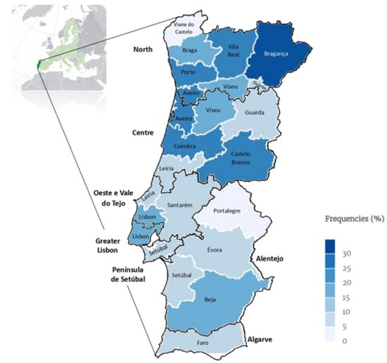 Of the total of 4716 animals included in this study, only 4445 distinct animal samples of plucked hairs and/or scraped scales were analysed, following the removal of contaminant fungi (5.8%; 95% CI: 5.1–6.5%; n = 271). Out of 4445 animals, 3877 (87.2%; 95% CI: 86.2–88.2%) tested negative for dermatophyte fungi while 568 (12.8%, 95% CI: 11.8–13.8%) tested positive. The majority of samples originated from Porto (22%; 95% CI: 20.7–23.2%; n = 975), Braga (17.8%; 95% CI: 16.7–19.0%; n = 792), Lisboa (15.4%; 95% CI: 14.4–16.5%; n = 685) and Viseu (9.7%; 95% CI: 8.9–10.6%; n = 433) (Figure 7).