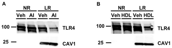 Exposing cultured macrophages to apoAI or HDL before PG stimulation decreases TLR4 translocation to lipid rafts. (A,B) Cultured macrophages were either pre-incubated with vehicle only (Veh), apoAI (“AI” shown in panel A), or HDL (B) before being challenged with PG. Pooled non-raft (NR) and lipid raft (LR) fractions were collected from treated macrophages to probe for TLR4 and the lipid raft marker caveolin-1 (CAV1) via immunoblotting. Size markers are in kDa.