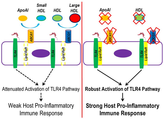 Early in T. brucei infection, macrophages in the liver and spleen mediate the humoral clearance of parasites and influence the developing immune response [27,28]. Macrophages contain a high lipid raft content and also exhibit potent pro-inflammatory effects from lipopolysaccharide (LPS) exposure [29]. Moreover, macrophages are known to efficiently efflux cholesterol to apoAI and HDL via the cholesterol efflux transporters ABCA1 and ABCG1, respectively [30]. We and others have shown that ABCA1/apoAI- and ABCG1/HDL-mediated cholesterol efflux decreases pro-inflammatory gene expression in macrophages and other cells that are challenged with the canonical TLR4 ligand LPS or other TLR4 ligands, and these effects are from cholesterol-efflux-reducing lipid raft TLR4 protein content [31,32,33,34,35,36,37]. Regarding TLRs, the TLR which is of central importance to innate immunity is TLR4 [38,39]. Interestingly, for TLR4 to induce pro-inflammatory gene expression, TLR4 first needs to translocate to lipid rafts after being activated by ligands on the cell surface [40]. Furthermore, the removal of cholesterol from cells promotes lipid raft disruption, and so cellular cholesterol efflux has been acknowledged as being anti-inflammatory due to stimulating lipid raft disruption [41]. Macrophages are also well-established to play a critical role in the pro-inflammatory immune response that occurs during T. brucei infection [42,43].