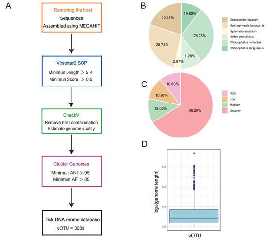 Recovery of tick DNA virus genomes. (A) Overview of the viral genome discovery workflow. (B) Numbers of viral genomes from different tick species. (C) Estimated genome quality (high, completeness > 90%; medium, completeness 50–90%; low, completeness < 50%; unknown, completeness uncertain). (D) Genome size statistics. vOTU, viral genome taxonomic operational unit.