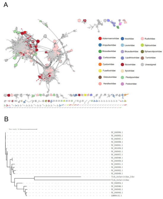 Classification of Tick DNA viral metagenomes. (A) vOTU gene-sharing network obtained from vConTACT2, visualized using Cytoscape. Viral genomes are colored according to their family assignment. (B) Phylogeny of African swine fever virus and its homologues. For each sequence, the accession number and virus name/strain are provided.