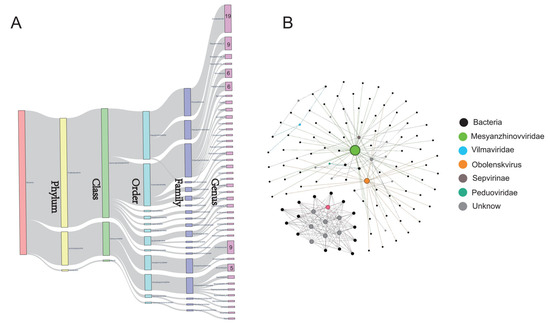 The bacterial host range of tick DNA viruses. (A) The Sankey diagram illustrates the taxonomic classification of bacterial hosts identified in tick samples, showing a detailed breakdown of the relationships from the phylum to the genus level. (B) The network visualization shows the relationships between the viruses and the host bacteria. Nodes represent individual bacteria and viruses, and edges indicate that a virus can infect certain bacteria. The colors of the nodes represent different viral families or unknown classifications. If a vOTU node is connected to different host nodes, it indicates that the vOTU is predicted to link to different host categories, suggesting a potentially broad host range.