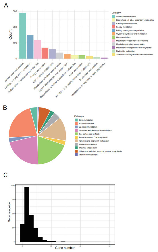 Auxiliary metabolic genes (AMGs) carried by viruses. (A) KEGG functional categories of protein-coding viral AMGs identified in all viral genomes. (B) Classification of AMGs within the metabolism of cofactors and vitamins pathways. (C) Numbers of viral genomes containing AMGs.