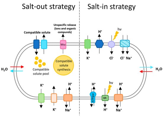 Potassium, the predominantly accumulated ion in this strategy, enters the cell through a uniport system (in response to membrane potential) (Figure 1). Potassium is taken up upon the expulsion of Na+ (maintenance of electroneutrality). As described above, sodium is excluded from the cytoplasm with the help of an Na+/H+ antiporter that uses the electrochemical proton gradient as a driving force (Figure 1) [].