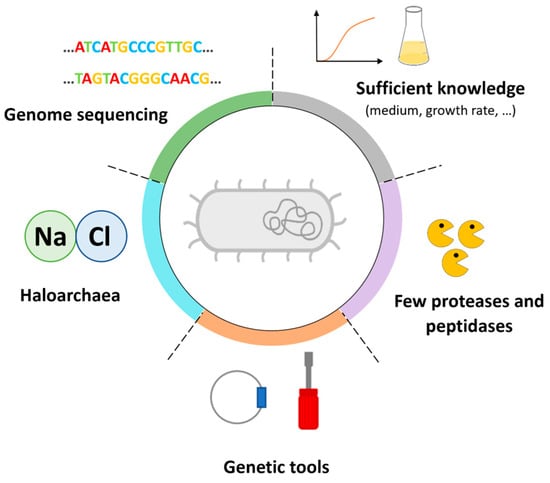 A haloarchaeal chassis must fulfil several conditions to be considered an ideal chassis (Figure 2). First, (i) sufficient knowledge of the microorganism of interest is required (such as the culture medium, generation time, etc.) []. (ii) A wide range of genetic manipulation tools (transformation methods, plasmid vectors, promoter libraries, etc.) are required to achieve the optimal production of the enzymes [,]. This makes it possible to modify the host organism, if necessary, in order to deplete degradation systems (the deletion of proteases capable of degrading the proteins of interest and restriction/modification systems so as not to interfere with the supply of exogenous DNA), to improve the folding of the proteins of interest (molecular chaperones, codon bias, etc) and to optimize transport systems (e.g., it is possible to fuse a signal peptide to the protein encoding our protein of interest) [,,]. This also requires (iii) the genome of the host organism to be completely sequenced [,]. Finally, (iv) to facilitate construction, the host must provide native plasmids (basis for vector construction) and (v) a limited number of proteases/peptidases (to limit the degradation of the overproduced enzyme).
