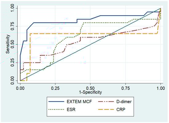 EXTEM MCF and INTEM MCF had similar diagnostic accuracies (p = 0.80). However, EXTEM MCF was found to have higher diagnostic accuracy than CRP (p = 0.006) and ESR (p = 0.019), and a higher diagnostic accuracy than D-dimer (p = 0.002).