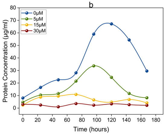 The current experiment investigated the influence of Cu on the growth of OA G20 planktonic and biofilm cells. A uniform decrease in the planktonic growth with an increase in Cu ion concentrations was observed (Figure 1a). At 5, 15, and 30 μM Cu ion concentrations, the maximum specific growth rate (μmax) of planktonic cells was approximately 0.012 h−1, 0.011 h−1, and 0.010 h−1, respectively, compared to 0.015 h−1 in control (0 µM CuCl2). Additionally, for planktonic cells, the total cellular protein was measured to eliminate obstructions in OD600 nm measurements due to the presence of any Cu sulfide precipitates produced during the growth experiments (Figure 1b). Also, measurements of the total cellular protein in planktonic cells showed a similar trend of consistent decrease in protein concentrations by 55.8%, 81.1%, and 92.8% for the 5 μM, 15 μM, and 30 μM Cu, respectively, in comparison to 0 µM. The effect of Cu toxicity on OA G20 planktonic growth is presented in Figure 1a,b. Furthermore, our findings are consistent with the results of previous studies of metal toxicity in SRB [20,22,36]. It is interesting to note that when OA G20 was grown in microtiter plates (refer to Section 3.2.1) with varying Cu ion concentrations, increased cell attachment was observed with the increase in Cu ion concentrations. Due to these differences in the levels of cell attachment, biofilm formation by OA G20 cells was further determined.