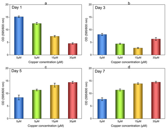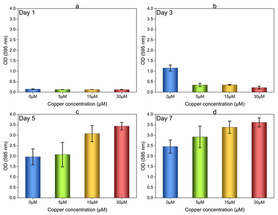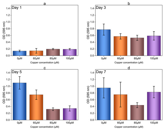 It should be noted that cell attachment occurred on the GCs from day 1, but not in the 96-well plates under the same experimental conditions. This discrepancy can be attributed to the differences in the material properties of the two surfaces. It has been previously suggested that cell attachment and initial biofilm formation can be greatly influenced by a wide range of surface characteristics, including surface area, hydrophobicity, charge, and roughness [38,39,40]. Prior studies have reported that polystyrene surfaces tend to promote more cell attachment compared to glass, which contradicts the findings of our experiments. However, we cannot rule out the possibility that better cell attachment on the glass surface in our study is due to the larger surface area compared to the small area in plates [38]. The observation of higher OD 595/600 values on day 1 (Figure 3a) for all of the variable Cu concentrations, compared to the OD 595/600 values on days 3 (Figure 3b), 5 (Figure 3c), and 7 (Figure 3d), remains unexplained and requires further investigation.