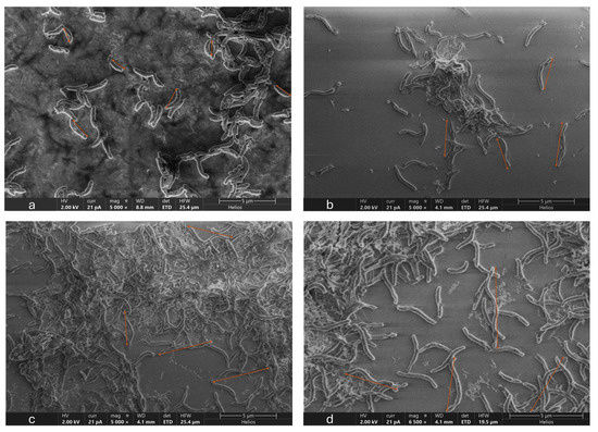 SEM images of OA G20 grown on GCs in lactate-C media (a) no-Cu; (b) 5 µM; (c) 15 µM; (d) 30 µM, respectively. OA-G2O biofilms were grown in 12-well plates inside the anaerobic chamber at 30 °C, static conditions. SEM images were taken on day 5 of OA G20 growth on GCs. The images were acquired at a scale bar of 5 µm, specified at the bottom right. The brown arrows on the images represent differences in cell length for cells grown in different Cu concentrations. Shorter arrows indicate normal rod-shaped cells in the control, while longer arrows show elongated cells observed at 30 µM Cu concentration.