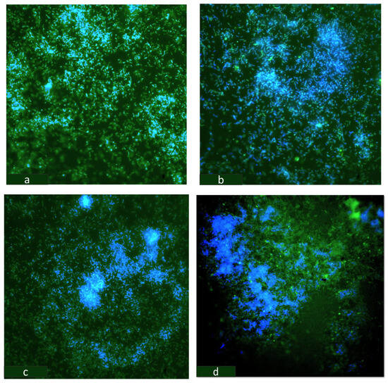 OA G20 biofilm grown on GCs in lactate-C media (a) no-Cu (control); (b) 5 µM-Cu; (c) 15 µM-Cu; (d) 30 µM-Cu stained with 200 µL of Syto9 followed by staining the EXP with Calcofluor White stain. The biofilms were analyzed using a confocal microscope. Magnification bar = 10 µm.