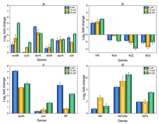 The possible metabolic processes involved in OA G20 biofilm formation under Cu ion stress include sulfur metabolism, polysaccharide biosynthesis, and electron transport [53]. Differential expression analysis was therefore performed on genes associated with these mechanisms. The study revealed both upregulated and downregulated genes for biofilms grown in 5, 15, and 30 µM Cu concentrations compared to the controls (Figure 10). Most of the genes showed an increase in their expression level in Cu-induced biofilms compared to the controls. The genes dsrA (Dde_0526), dsrB (Dde_0527), aprA (Dde_1109), and sat (Dde_2265), play key roles in the dissimilatory sulfate reduction pathway, and they exhibited differential upregulation in their expression levels relative to the controls. The most upregulated gene in the sulfur metabolism (log2FC = 4.434) was dsrA (Dde_0526), as found in the 5 µM-biofilms. However, no significant difference was observed between the 15 µM (log2FC = 3.426) and 30 µM (log2FC = 3.292) expression levels. Moreover, the sat (Dde_2265) and aprA (Dde_1109) genes did not display significant differences in expression levels across the tested Cu concentrations (Figure 10a). The coordinated action of these genes allows OA G20 to convert the sulfate to H2S. The Sat converts the internalized sulfate to adenosine-5′-phosphosulfate (APS), which is then reduced to sulfite by aprAB. Now, the dsrAB enzyme complex initiates the reduction of sulfite, partially converting it to H2S. The final reduction is carried out by dsrC, which facilitates the final reduction of sulfite to H2S. The upregulation of dsrAB, aprA, and sat may indicate an adaptive response triggered under Cu stress to meet higher energy demands required for biofilm formation [43,54,55,56]. The use of KEGG pathway map00920 provided a framework for identifying key genes involved in dissimilatory sulfate reduction [57]. Our analysis revealed a lack of clear pattern in the upregulation of the above-mentioned genes (dsrA, dsrB, aprA, and sat) in response to increasing Cu ion concentrations, indicating that OA G20 at high Cu concentrations might be saving energy for other essential metabolic functions. This irregularities in the gene expression levels of stress-induced biofilms need further investigation.