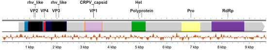 Regions of the translated genome of the complete genome sequence obtained in this work. The Mosq_B20_SP01 genome is represented by a single strand of positive RNA, consisting of a single ORF coding for a polyprotein, which when processed produces structural proteins (VP2 in light blue, VP4 in red, VP3 in dark blue and VP1 colored in orange), as well as non-structural proteins (Helicase colored green, Protease colored yellow and Polymerase RdRP colored lilac), as is characteristic of iflaviruses. The “rhv_like” protein domains of VP2 and VP3 are highlighted in black, as well as the “CRPV_capsid” protein domain of the VP1 protein is colored in light lilac at 10%. Below the representation of the polyprotein, the variation in GC content (guanine and cytosine) throughout the genome of our viral sequence is highlighted.