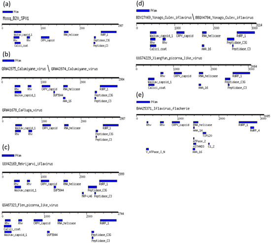 Protein domains of Mosq_B20_SP01 polyproteins compared to other iflaviruses. In (a–d) the main protein domains of viral sequences that infect culicidae are represented; in (e), the protein domains of the viral sequence of the type species that does not infect mosquitoes. The viral sequences that infect mosquitoes have many protein domains in common, and the sequence representing the type species presented a greater number of different protein domains compared to the viral sequences that infect mosquitoes.