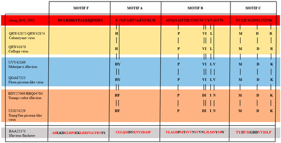 Comparison between motifs F, A, B and C of the RdRP protein domain. The vertical lines indicate the variations in the amino acid residue positions of the RdRP protein motifs between Mosq_B20_SP01 and the other mosquito-infecting sequences. Mosq_B20_SP01 and the other sequences that infect mosquitoes, demonstrated great similarity to each other, forming 4 groups highlighted in red colors (Mosq_B20_SP01, infects mosquitoes of the genus Anopheles); light orange (BDV27069, BBQ04784, UUG74229—genus Culex); light blue (UVV42169, QGA87323—genus Ochlerotatus); and light gold (QRW42875, QRW42874 and QRW41678—genus Culiseta). The Iflavirus flachiere sequence, highlighted in gray, showed great divergence in its amino acid residues (divergent residues highlighted in red) of the RdRP protein motifs in relation to the residues of the sequences that infect mosquitoes.