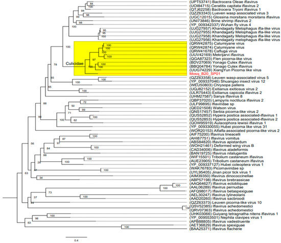 Maximum likelihood phylogenetic tree constructed based on amino acid sequences from the RdRP region. The bar corresponds to the nucleotide diversity along the branch of the tree. The virus obtained in this investigation is shown in Red (Mosq_B20_SP01). The putative new virus clustered, strongly based on the high bootstrap of 100, into a distinct clade representing a group of mosquito-infecting iflaviruses of the Culicidae family, represented in Yellow.