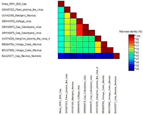 We used the nucleotide identity of the complete genomes of Mosq_B20_SP01 and other viruses with culicidae hosts to compare genetic diversity. In general, the paired identities of iflaviruses infecting culicidae hosts and the putative new iflavirus obtained in this study ranged from 57.05% to 63.68%. We also performed the same for the translated sequences of the capsid regions for the same group of sequences mentioned above, and the identities in relation to our query varied from 26.54% to 53.84%, as shown in Figure 5, thus being below the minimum limit of 90% required as a criterion by the ICTV for it to be considered as belonging to the same species in relation to the compared sequences. Therefore, Mosq_B20_SP01 possibly corresponds to a new species of iflavirus. We also applied the identity matrix to the helicase and capsid region of these viruses (Figure S2).