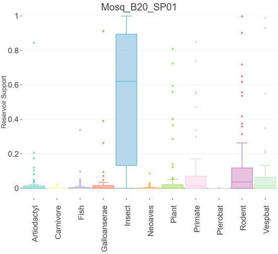 For host prediction of Mosq_B20_SP01, the Viral Host Predictor was performed, which uses the gradient boosting machine algorithms developed by Babayan et al. (2018) [44] to predict reservoir hosts, arthropod vectors and virus transmission status RNA transmitted by arthropods. Algorithm predictions are based on host-associated biases in viral genomes (“genomic biases”) and phylogenetic relatedness to viruses with known transmission ecology (“phylogenetic neighborhood”). Figure 6 suggests that Mosq_B20_SP01 has an affinity for insect hosts.