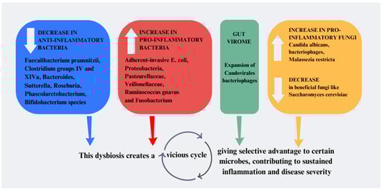 This dysbiosis creates a vicious cycle, perpetuating inflammation and disease severity: inflammatory gut environments may give a selective advantage to certain microbes, contributing to sustained inflammation [] (Figure 1).