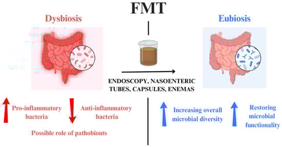 FMT involves transferring minimally manipulated, pre-screened donor stool into the gastrointestinal tract of a patient. This procedure aims to ameliorate dysbiosis by increasing overall microbial diversity and restoring microbiota functionality [].