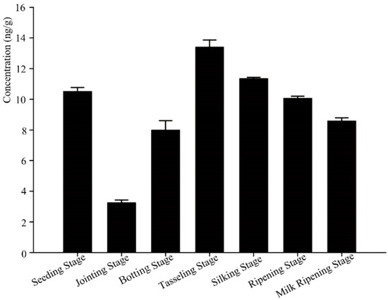 The content of Bt protein in the rhizosphere soil of the transgenic maize Ruifeng125 changed greatly during the vegetative growth periods. From the perspective of the whole growth cycle of maize, the content of Bt protein reached the maximum value at the tasseling stage, reaching 13.4 ng/g, and then the content of Bt protein in the rhizosphere soil at the following stages gradually decreased (Figure 1).