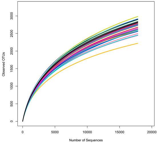 The V3-V4 region of the 16S rRNA gene of bacteria of rhizosphere soil samples was sequenced on the Illumina Miseq PE 300 (Illumina, San Diego, CA, USA) platform, generating 1,382,450 high-quality reads and 606,846,719 base numbers, with the 99.99% average inter-group sequencing coverage, indicating that the data measured in this experiment can truly reflect the composition of most bacterial groups in the sample (Table 2). The curve of the number of observed OTUs tended to be stable (Figure 2), which indicated that the amount of sequencing data of the sample was enough to cover most microbial taxa.