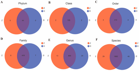 Venn diagram of bacterial community obtained from rhizosphere soil samples of two maize varieties at different classification levels: (A) phylum level; (B) class level; (C) order level; (D) family level; (E) genus level; (F) species level. Z, transgenic maize Ruifeng 125; D, non-transgenic control.