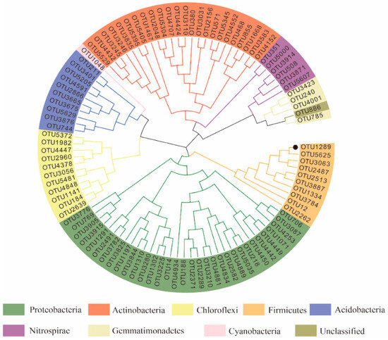 The corresponding sequence of the top 100 OTUs with the most abundance among all the samples was selected to construct an evolutionary tree according to the NJ (neighbor joining) adjacency method, presenting the species composition relationship of bacteria in the rhizosphere soil in the form of a circular evolutionary tree. These bacteria belong to nine phyla, including Proteobacter, Actinobacter, Chloroflexi, Firmicutes, Acidobacter, Nitrospirae, and Germatimonadetes. In the ring species evolution tree, the number of OTUs in three phyla is ≥10%. Proteobacteria is the largest group at the phyla level, including 33 OTUs, followed by Actinobacteria (24 OTUs), Chloroflexi (11 OTUs), and Firmicutes (10 OTUs). OTU1289 (Bacillus niacini) owned 10,550 reads, and its abundance was significantly higher than that of other OTUs (Figure 4).